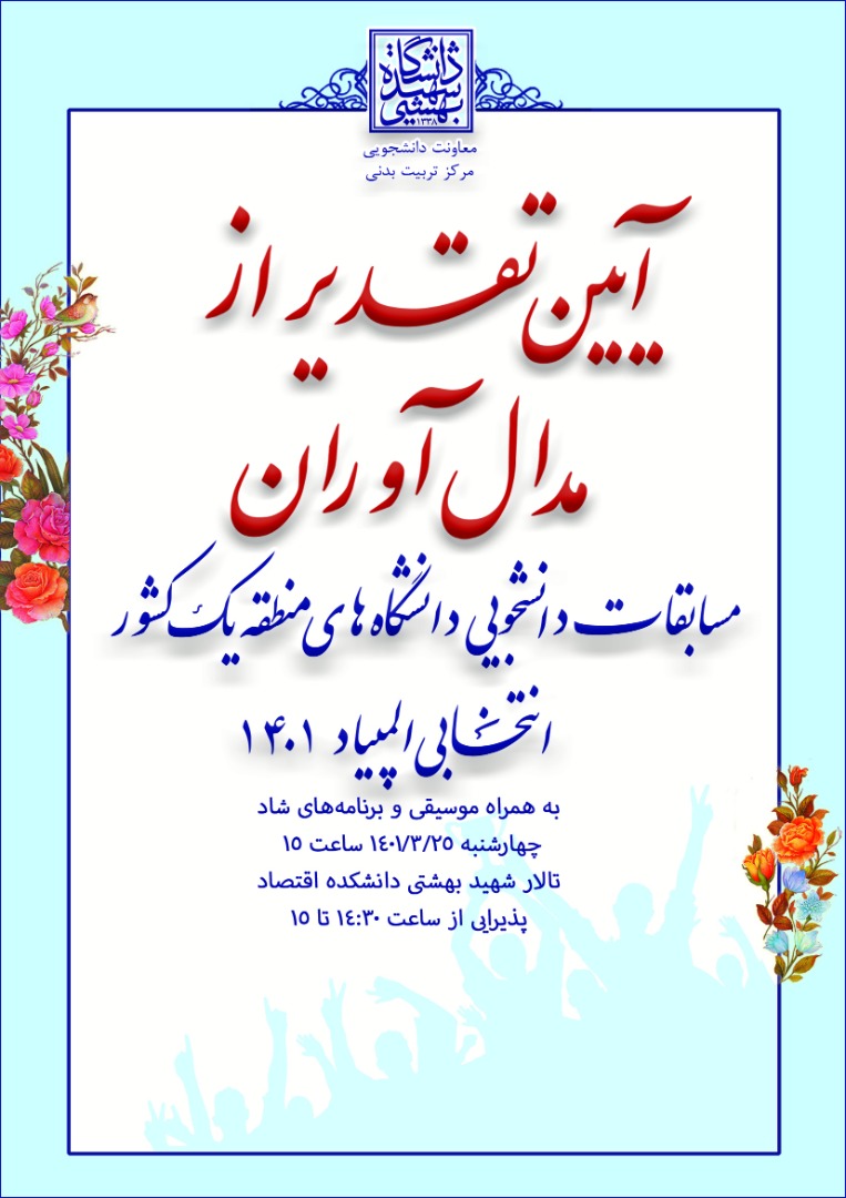 صفحه اصلی آیین تجلیل از قهرمانان و مدال آوران ورزشی دانشگاه شهید بهشتی 33689 بازدید print share تالار ابوریحان مرکز همایش های بین المللی دانشگاه شهید بهشتی در شب عید سعید غدیر خم با حضور ریاست...