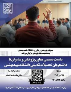 نشست صمیمی معاون پژوهشی و مدیران با دانشجویان تحصیلات تکمیلی دانشگاه شهید بهشتی یکشنبه ۱۱ آذر ۱۴۰۳ برگزار می‌شود.
