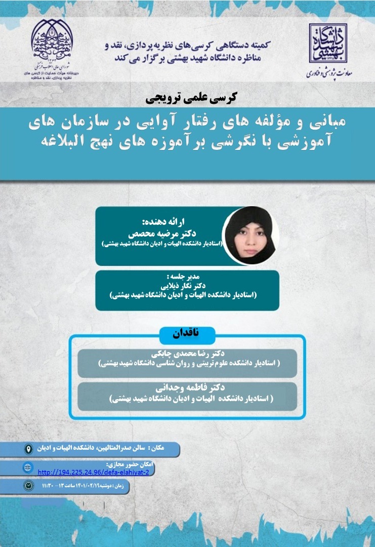 کرسی علمی ترویجی مبانی و مولفه های رفتار آوایی در سازمان های آموزشی با نگرشی بر آموزه های نهج البلاغه در دانشکده الهیات و ادیان، سالن صدرالمتالهین در روز دوشنبه 19 اردیبهشت 1401 برگزار میشود.