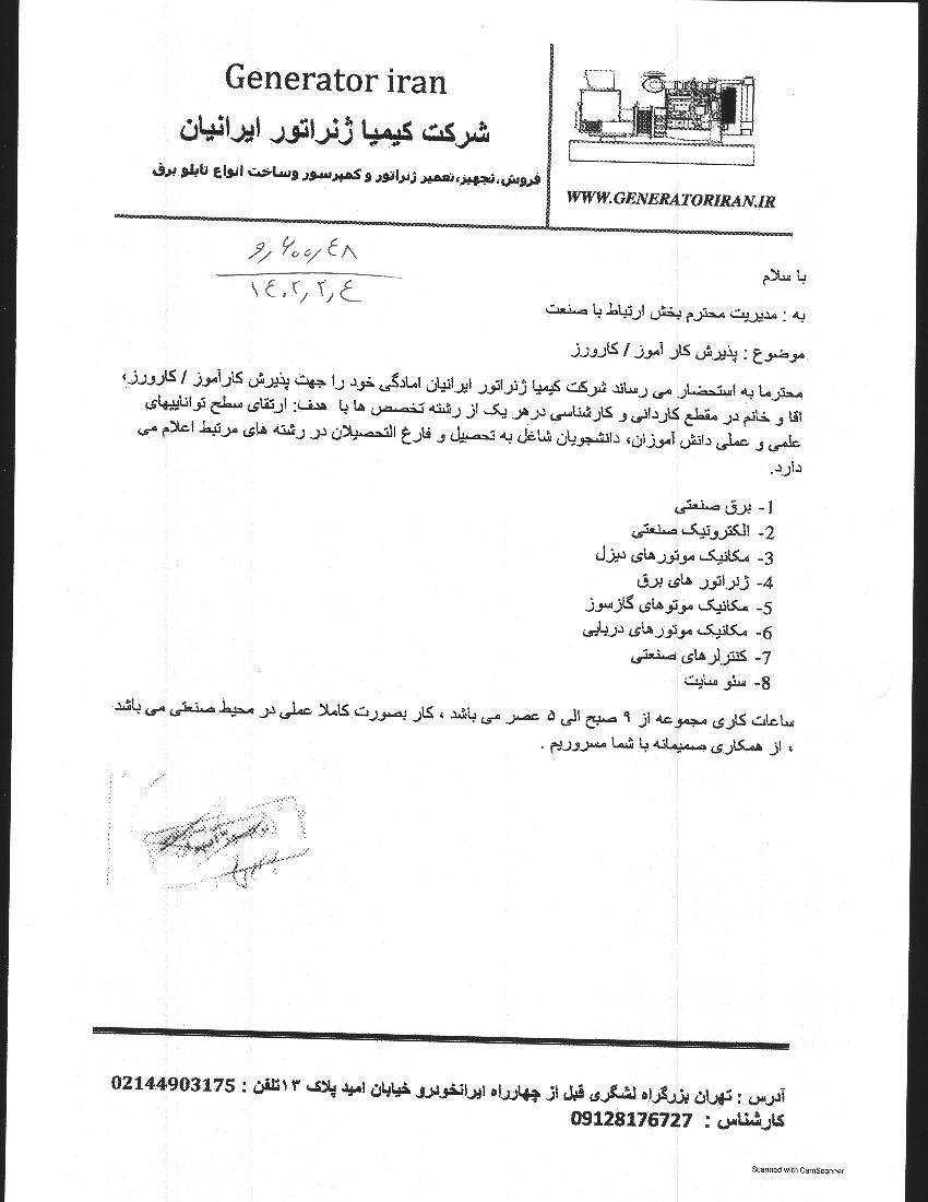 پذیرش کارآموز و کاروز در شرکت کیمیا ژنراتور ایرانیان