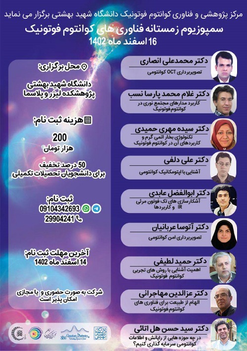سمپوزیم زمستانه فناوری‌های کوانتوم فوتونیک ۱۶ اسفند ۱۴۰۲ در دانشگاه شهید بهشتی برگزار می شود.