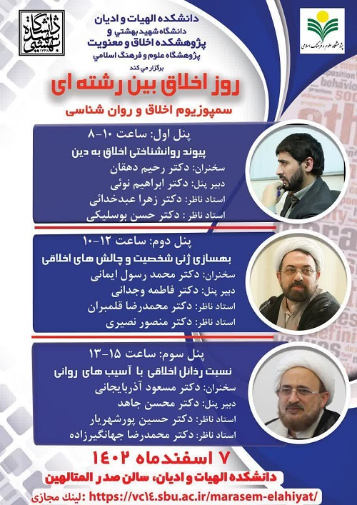 نشست علمی با عنوان «روز اخلاق بین رشته‌ای، سمپوزیوم اخلاق و روانشناسی»؛ دوشنبه 7 اسفند 1402 در دانشگاه شهید بهشتی برگزار می شود.